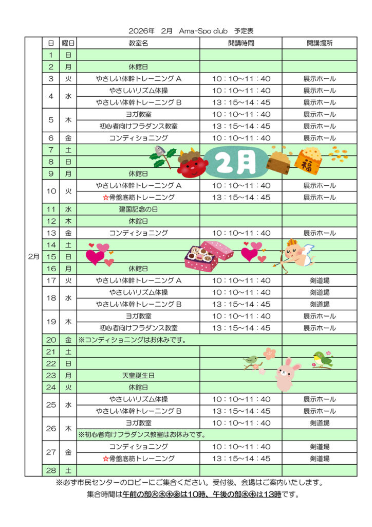 - 各教室へのご参加は先着順となっています。初めて受講される場合は、必ず電話で開催日・定員数をご確認のうえご参加ください。
